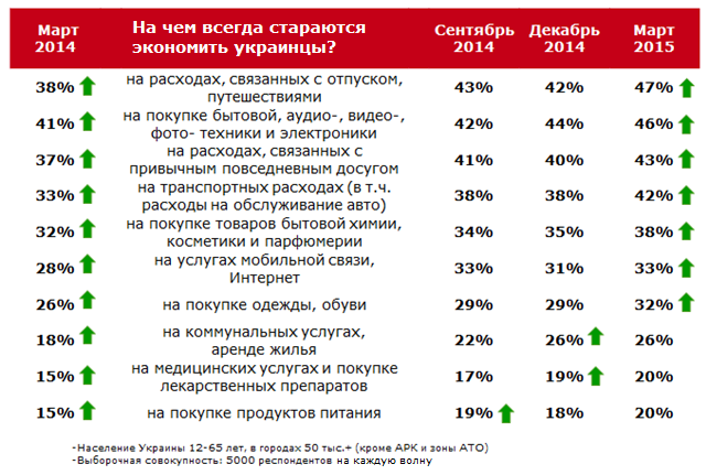 Если сравнить март 2014-го и март 2015 года, то украинцы стали экономить буквально на всем: начиная от отпуска и заканчивая продуктами питания. Как бы там ни было, коммунальные услуги / аренда жилья, лекарства и еда пока остаются статьями расходов, на которых экономят меньше всего.