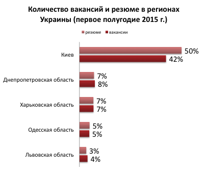 Как и в предыдущие периоды, максимальное количество как вакансий, так и резюме размещают в Киеве. Существенным отличием от аналогичного периода прошлого года является закономерная потеря лидерских позиций Донецким регионом. В целом же топ-5 регионов выглядит стандартно: Киев (со значительным отрывом), Днепропетровск, Харьков, Одесса, Львов.