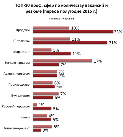 Ситуация со спросом и предложением на рынке выглядит достаточно предсказуемой. Максимальное количество вакансий работодатели предлагали для специалистов по продажам и программистов. Востребованы на рынке также маркетологи (чаще всего речь идет о тех же продажах или об интернет-маркетинге), молодые специалисты, административный персонал и квалифицированные производственные специалисты. В то же время лидеры по количеству резюме — молодые специалисты. Значительное количество резюме размещают также специалисты по продажам и IT-специалисты, бухгалтеры, финансисты и админперсонал.