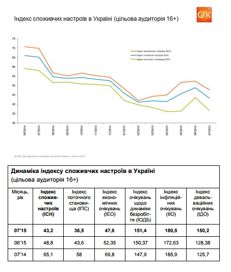 В июле 2015 года потребительские настроения украинцев ухудшились. Индекс потребительских настроений (ИПН) равен 43,2, что на 5,7 п. меньше, чем в июне. Существенные изменения претерпели девальвационные ожидания и индекс целесообразности крупных покупок. Об этом свидетельствуют данные исследования потребительских настроений в Украине, которое ежемесячно осуществляет GfK Ukraine