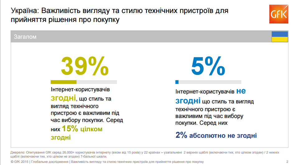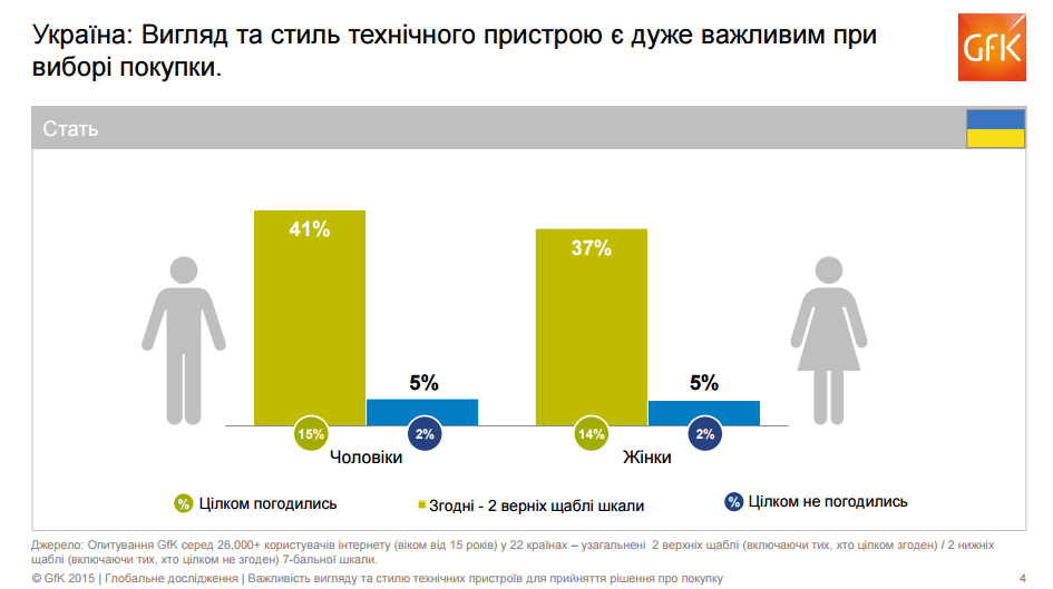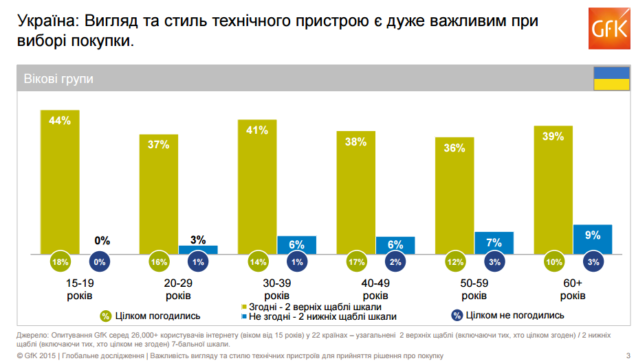 В Украине только 5% интернет-пользователей не согласились с тем, что вид и стиль технического устройства являются важным критерием при выборе покупки, в то время как 39% согласны с этим утверждением. Большое значение внешнему виду технических устройств придают респонденты в возрастных группах 15–19 и 30–39 лет, респонденты в возрасте старше 60 лет уделяют этому меньше всего внимания.