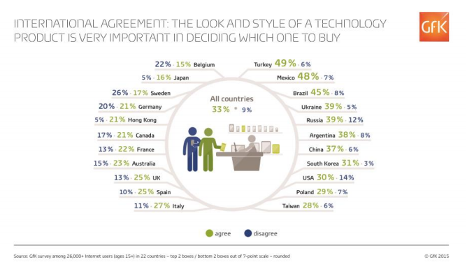 В ожидании выпуска ряда технических новинок этого лета GfK публикует результаты международного исследования на тему важности вида и стиля технических устройств для пользователей при принятии решения о покупке. «Каждый третий покупатель полностью соглашается с тем, что вид и стиль технического устройства является важным критерием выбора при совершении покупки», — говорят аналитики GfK. Больше всего с этим соглашаются в Турции, Мексике и Бразилии; в Швеции, Бельгии и Германии с этим согласны меньше всего