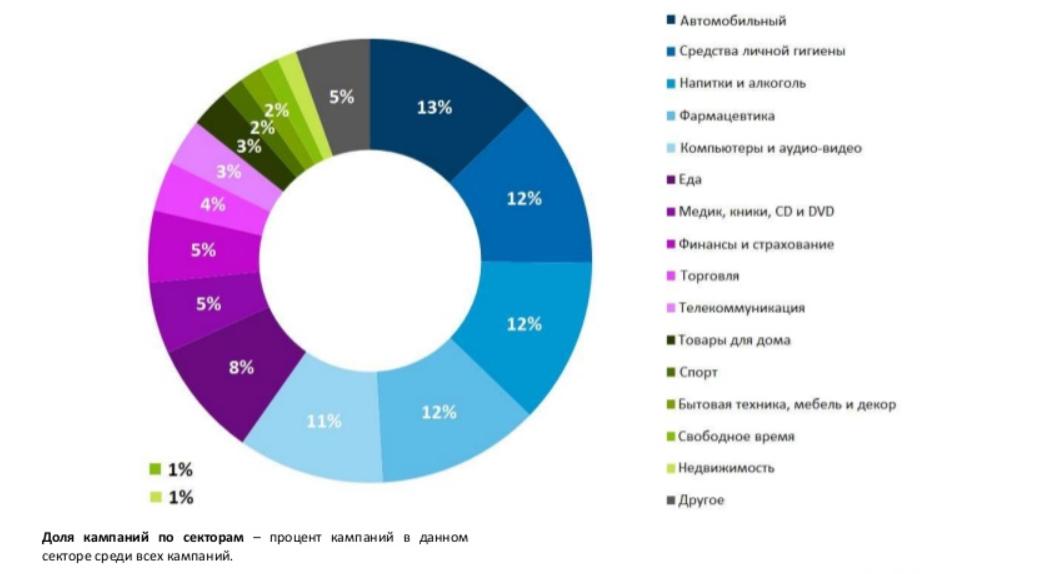 Доля кампаний по секторам — это процент кампаний в данной отрасли среди всех кампаний. По диаграмме видно, что больше всего рекламируются в онлайне автомобильный сектор, а также FMCG (средства личной гигиены, алкоголь, напитки).