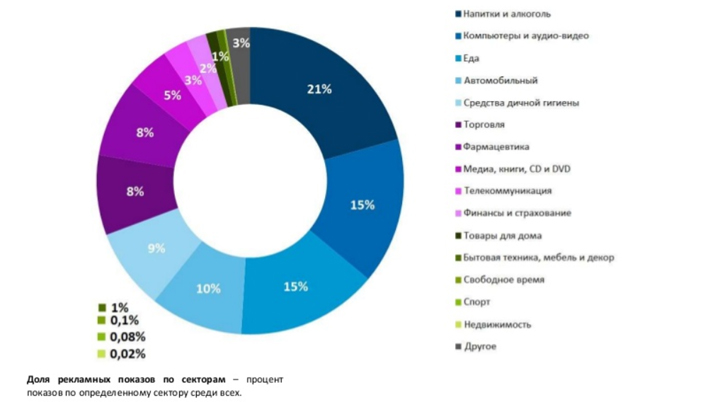 Исследователи проанализировали также долю рекламных показов по отраслям: