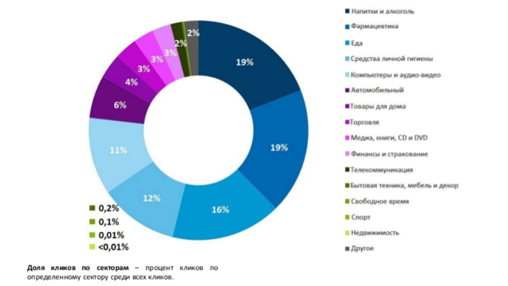 Если же смотреть на процент кликов по определенному сектору среди всех кликов, окажется, что чаще всего кликают на рекламу напитков и алкоголя: