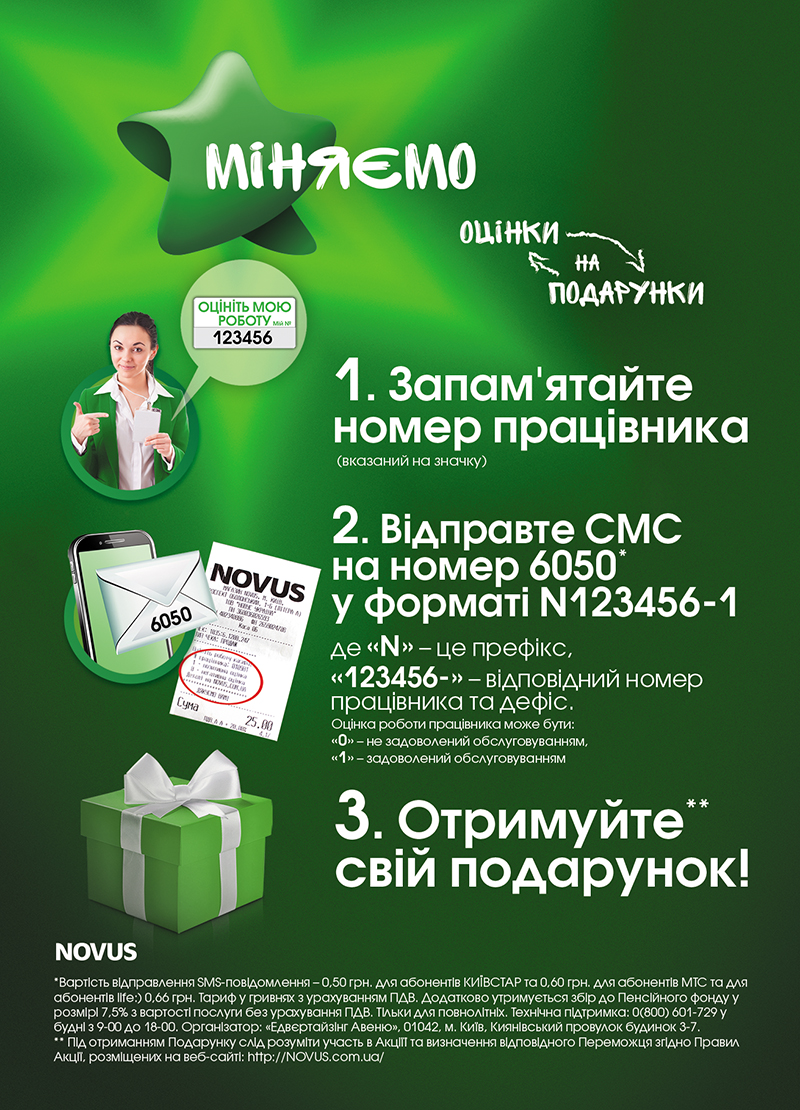 - Внешнее – это sms-голосование покупателей. Покупатели смогут оценить работу сотрудников NOVUS, поставить оценку и тем самым приблизить или отдалить кого-то от победы. Тут как-то перепишите – много двоеточий и знаков.