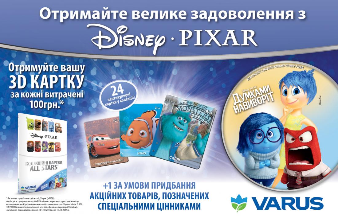 С 1 октября по 18 ноября 2015 года во всех супермаркетах сети VARUS действует акция «All Stars (Всі Зірки)». В этот период все покупатели могут собрать коллекцию из 24-х 3D карточек с изображениями героев из самых популярных мультфильмов Disney Pixar.