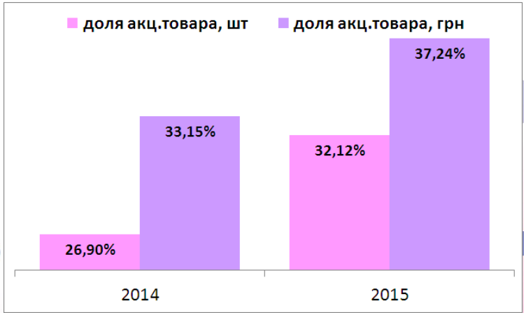 Средняя розничная цена в сети с сентября 2014 года по август 2015-го увеличилась с 23 до 32 грн. С учетом промо и скидок, которые предоставляются на 30% ассортимента, розничная цена возросла на 30%. При этом в штуках основной ассортимент сократился примерно на 9%.