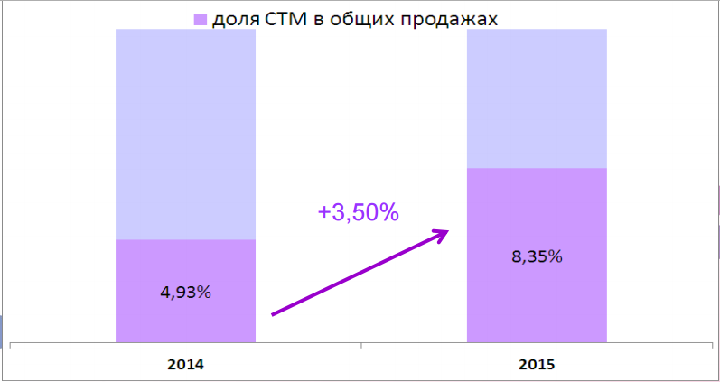 Доля продаж СТМ в общих продажах выросла с 4,9 до 8,3% в 2015 году. В планах компании — увеличить долю private label до конца года до 10%, а к следующему году довести этот показатель до 15%.