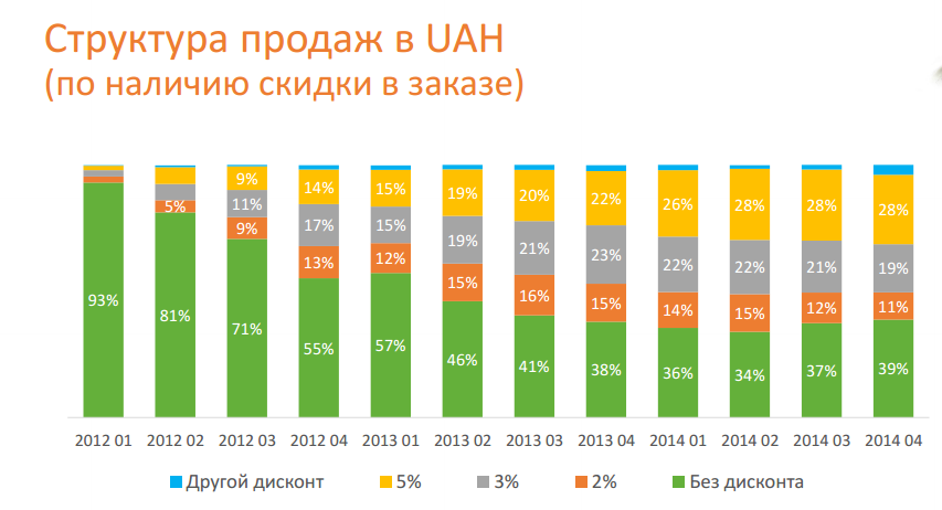 Несмотря на рост выручки, маржинальность покупок постоянных клиентов была невысока из-за системы лояльности. В 2104 году в Pampik действовала накопительная система скидок: за покупку от 1 500 до 3 000 грн начислялась скидка 2%, от 3 000 до 7 000 грн — 3% и от 7 000 — 5%. Получалось, что самые давние и лояльные клиенты Рampik приносили самый низкий маржинальный доход.