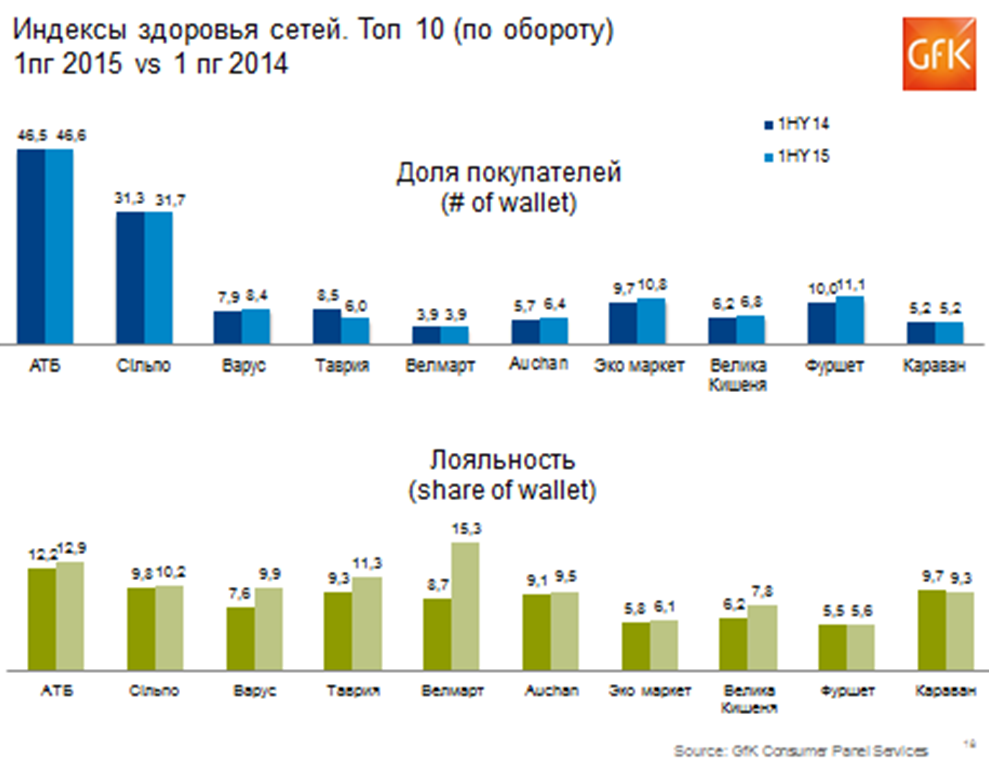 Меньшее количество украинцев стало покупать в супермаркетах (что связано и с объективными трудностями, с которыми столкнулись некоторые игроки, представленные в этом формате в зоне АТО и прилегающих к ней районах) и Cash & Carry. Как результат, эти форматы потеряли свою долю рынка. Тем не менее таким сетям, как «Брусничка», Varus, «Велика Кишеня», «Вопак», Novus, «Сільпо» и «ЭКО маркет», удалось даже увеличить свою долю рынка.