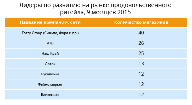 В рейтинге самых активно развивающихся сетей также произошли изменения. По данным GT Partners Ukraine, по результатам девяти месяцев в пятерке лидеров оказались две новые сети, работающие в Западной Украине: «Рукавичка» и «Близенько». С января по сентябрь они открыли 12 торговых точек, тогда как за аналогичный период прошлого года — девять и пять соответственно. В то же время из топ-5 исчезли днепропетровская сеть Varus и донецкая «Брусничка».