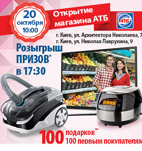 Первые 100 покупателей, которые приобрели товары на сумму от 100 грн одним чеком, гарантированно получили подарок — продуктовый набор. Также состоялись розыгрыши телевизоров, пылесосов и мультиварок.
