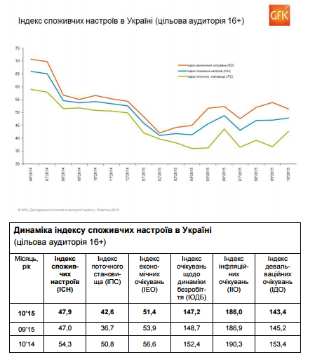 В октябре 2015 потребительские настроения украинцев несколько улучшились. Индекс потребительских настроений (ИПН) равен 47,9, что на 0,9п. больше, чем в сентябре.