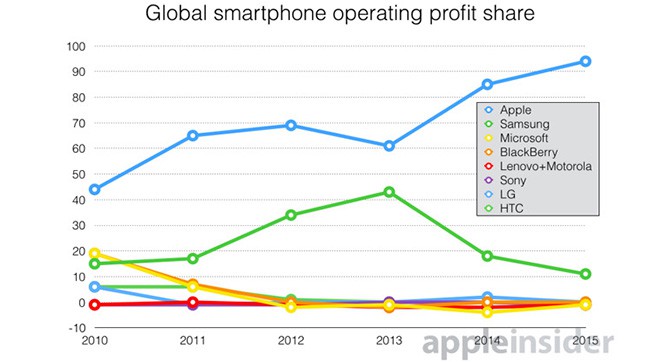 Столь существенная доля в общем объёме прибыли выглядит ещё более впечатляюще, если учесть, что на Apple приходится лишь 15% в общем объёме продаж. Таким образом, 15% продаж генерируют 94% всей прибыли рынка. Это объясняется высокой стоимостью устройств компании (средняя цена смартфона iPhone увеличилась с $620 в прошлом году до $670 в третьем квартале 2015 года) и высокой нормой прибыли — 37%.