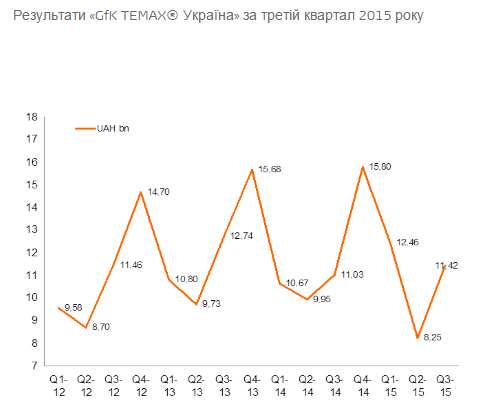 Рынок бытовой техники и электроники в Украине в третьем квартале 2015-го составил 11,4 млрд грн, что на 3,6% больше, чем в 2014 году. Большинство секторов рынка выросли: телекоммуникации — на 21,6%, офисная техника — на 5,3%, крупная бытовая техника — на 4,1% и информационные технологии — на 1%. Падение испытали сектора фото- и бытовой электроники — на 27,7% и 14,6% соответственно, а также мелкая бытовая техника — на 3,8%.