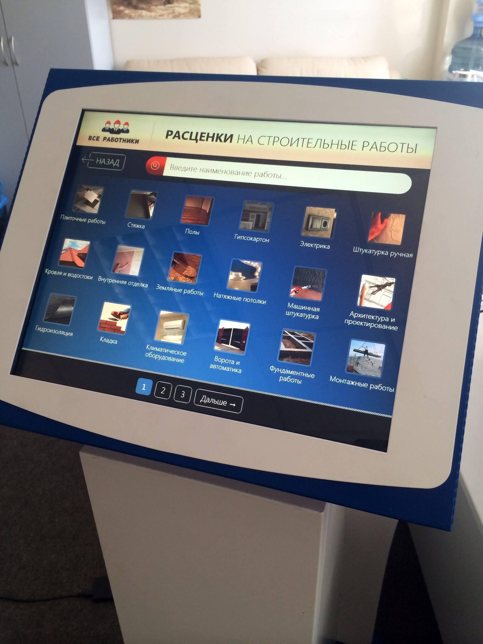 Информационно-справочные терминалы — это новый проект украинского интернет-ресурса поиска строителей VseRabotniki.com. Любой покупатель может узнать информацию о расценках на все строительные работы в Украине и найти мастера прямо в магазине. Терминал работает по принципу сайта «Все работники»: пользователь может заказать услугу мастера, которая сразу попадает в перечень минитендеров сайта, и получать предложения от зарегистрированных мастеров.