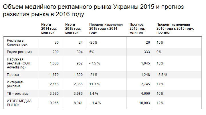 В целом, рекламный медиарынок Украины в 2015 году по сравнению с 2014 годом остался практически при своих гривнах (падение в 1.4% не в счет). Эксперты ВРК надеются, что следующий год будет более урожайным, позволив подрасти по суммарным бюджетам минимум на 12% и достигнув круглой цифры в 10 миллиардов гривен.