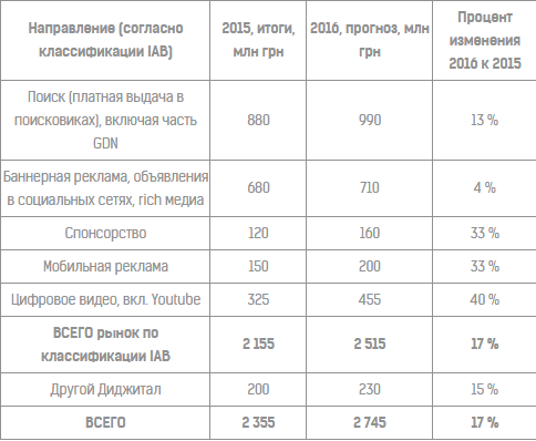 Максимальный рост в 2015 и 2016 у цифрового видео, в том числе благодаря Youtube составляющей, а также ожидаемому применению аукционов. Эксперты ВРК предполагают, что первая половина 2016 будет адаптацией к новым правилам закупок видео (аукционам), а также прогнозируют, что вторая половина 2016 года может показать еще более динамичный рост.