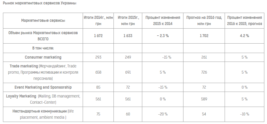 Согласно прогнозу экспертов Международной Ассоциации Маркетинговых Инициатив (МАМИ), в 2015 году продолжается падение объемов рынка маркетинговых сервисов. Негативная динамика по всем категориям, кроме программ, которые помогают увеличить продажи здесь и сейчас, повысить лояльность существующих клиентов (Trade Marketing и Loyalty Marketing). По итогу года спад в целом составил 2,3%. Динамика падения замедлилась, в 2016 году возможен незначительный рост. Но базируясь на общем состоянии экономики Украины, прогнозах развития ключевых отраслей-рекламодателей и ожидаемом уровне инфляции, эксперты затрудняются говорить о восстановлении отрасли в следующем году. Ситуация может улучшиться, если будут проведены кардинальные реформы, примут новый налоговый кодекс, и это повлияет на стабилизацию как в стране в целом, так и на рынке маркетинговых сервисов.