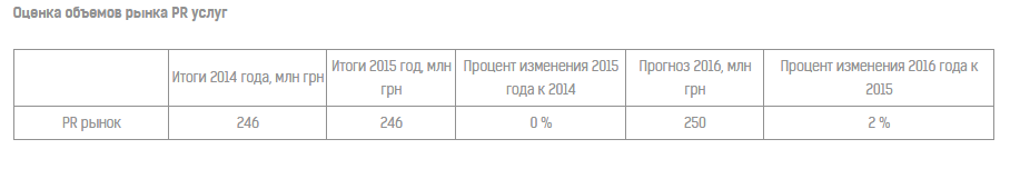 Впервые за все время экспертных оценок рынка PR специалистами ВРК и UAPR результаты года существенно отличаются, по мнению корпоративного сектора и агентств. Так, агентства показывают в среднем отсутствие изменений в биллингах по отношению к 2014 году (бюджеты равны бюджетам предыдущего года), а клиенты говорят о падении своих PR бюджетов на 30%.