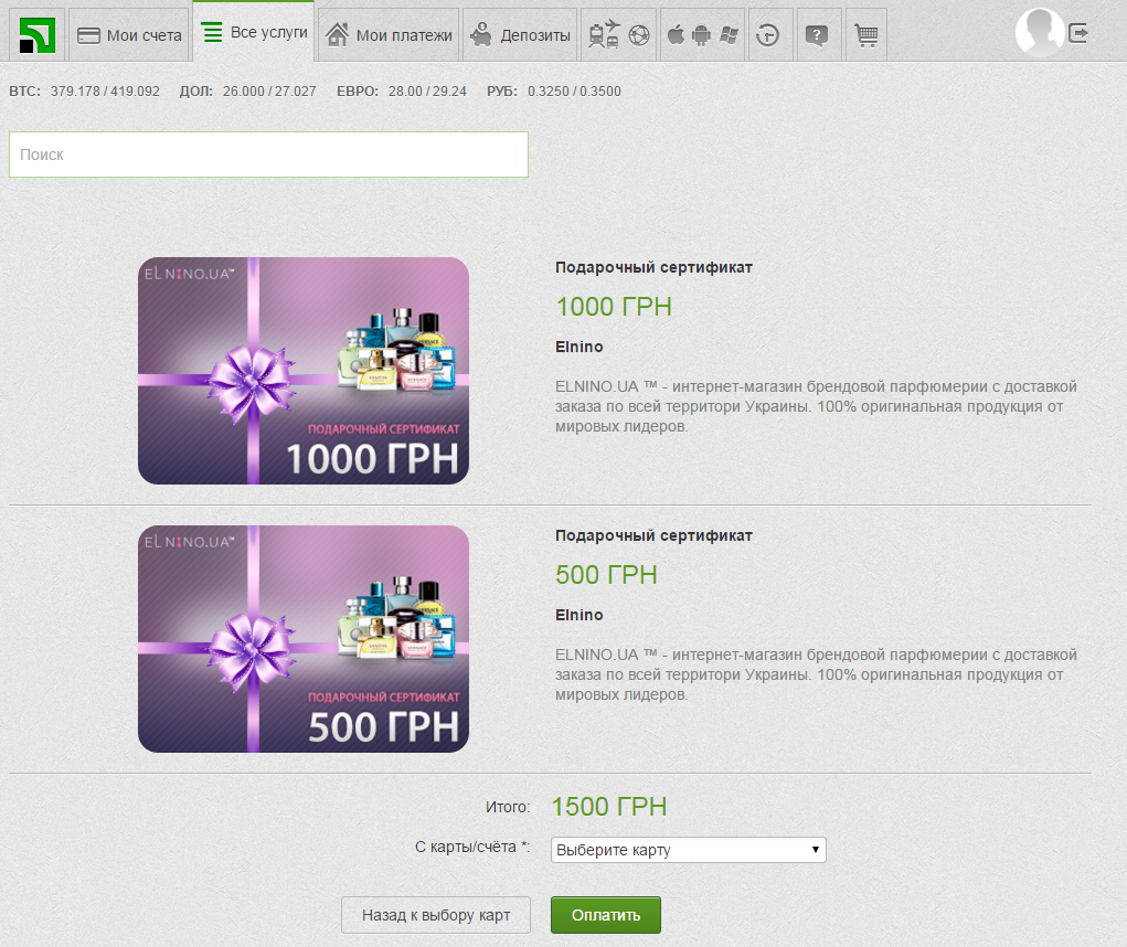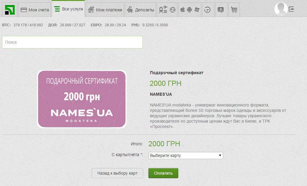 В «Приват24» магазин Gift Card находится в разделе «Все услуги». Карты разделены на три категории: мужские, женские и детские.