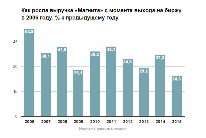 Крупнейший ретейлер России, «Магнит» в 2015 году также не дотянул до собственного прогноза роста продаж в 26–28%. Основатель и гендиректор «Магнита» Сергей Галицкий ранее прогнозировал, что результат будет ближе к нижней границе диапазона «плюс-минус полпроцента» (то есть примерно 25,5–26,5%). Причем это был уже скорректированный в меньшую сторону прогноз — до июля 2015 года ретейлер рассчитывал по году прирасти на 28–32%.