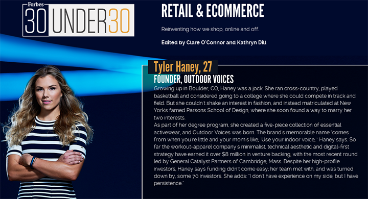 На первом месте оказалась основательница бренда одежды для активного отдыха Outdoor Voices Тайлер Хэйни.