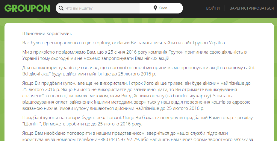 На главном сайте «Групон Україна» появилась запись goodbye, где говорится о том, что сервис прекращает свою работу. При этом указывается, что компания выполнит в течение месяца все обязательства перед клиентами, купившими сертификаты. Срок действия акций заканчивается 25 февраля.
