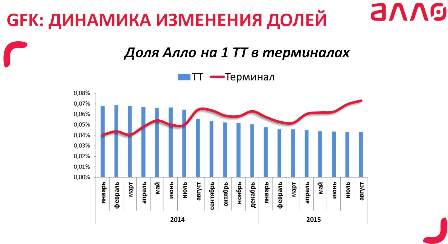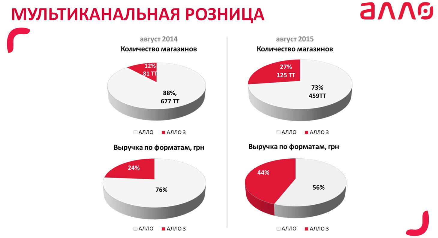 С 2014 года сеть «Алло» почти вдвое уменьшила число магазинов — с 677 до 459. При этом магазины открывались в новом формате. Результатом стало увеличение выручки и рыночной доли. По данным Forbes, выручка сети «Алло» в 2014 году составила 2,167 млрд грн, а в 2015-м — около 2,6 млрд грн. Маркетинг-директор ГК «Алло» Евгений Резуев рассказал, что было сделано за год и как менялись показатели эффективности