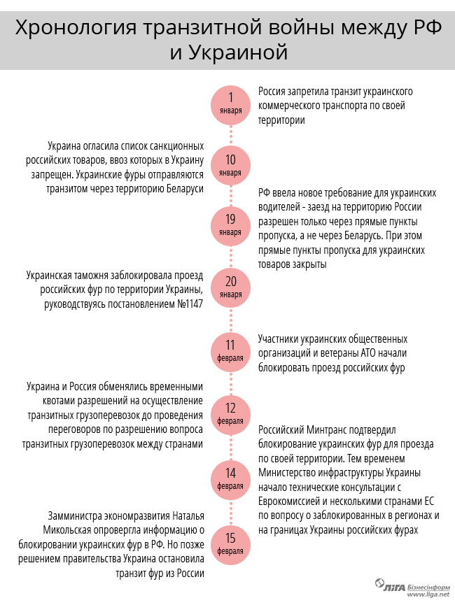 Ространснадзор, который официально опровергал задержку украинского транспорта на территории РФ, 14 февраля признал, что в России задержана 161 машина с украинской регистрацией. Свои действия в ведомстве назвали ответом на блокирование движения российских фур через Украину активистами. 15 февраля украинское правительство официально ограничило въезд грузового автотранспорта с российской регистрацией на территорию Украины. По словам главы Государственной фискальной службы Романа Насирова, в Украине задержано не более 100 автомобилей из РФ.