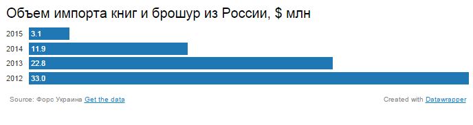 По данным директора книготорговой компании «Форс Украина» Александра Кирпичева, объем импорта книг и брошюр из России падает: в 2015 году импорт книг из России составил $3,06 млн, что в четыре раза меньше, чем в 2014-м. «Много книг поступает в Украину контрабандным путем, а также печатается контрафактным способом на территории Украины. Контрабанды больше, чем легального импорта». По словам Красовицкого, в 2015-м объемы контрабанды из России в 2,5 раза превысили официальный объем импорта. Сокращение объемов импорта, по мнению Александра Красовицкого, происходит за счет удешевления продукции в валютном выражении из-за падения курса рубля к доллару. «Рублевые» книги стали дешевле.