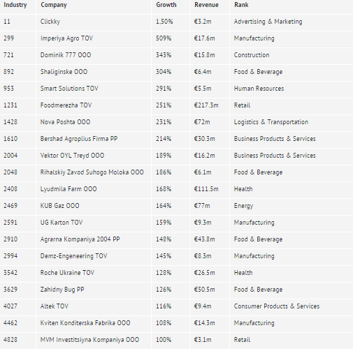 Издание о предпринимательстве The Inc обновило рейтинг топ-5000 самых быстрорастущих частных компаний в Европе за 2016 год. Украинская компания мобильного маркетинга Clickky попала в топ-20, на 11 место рейтинга, а всего в нем удалось насчитать 21 компанию из Украины, включая «Новую почту», «Рош Украина» и другие. Что характерно, в прошлом году ни одной украинской компании в рейтинге не было