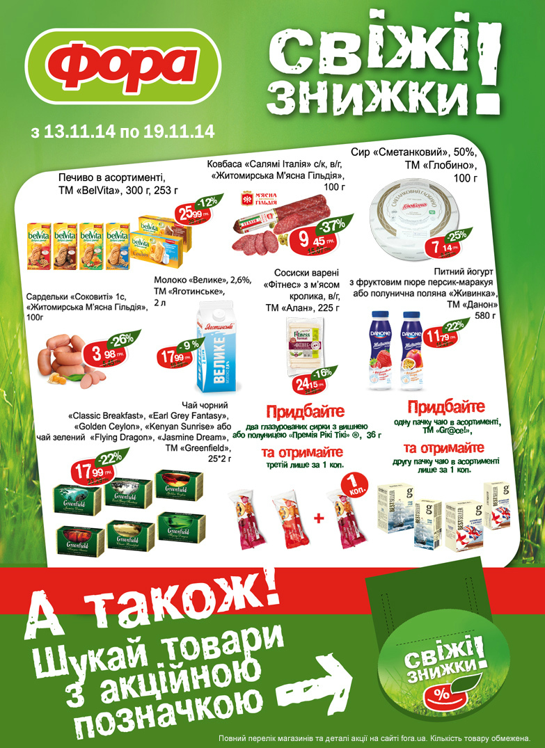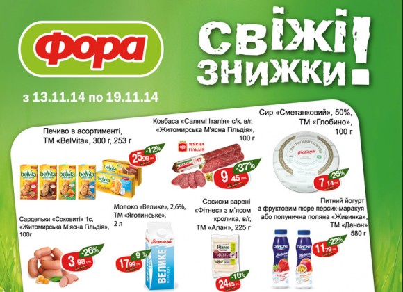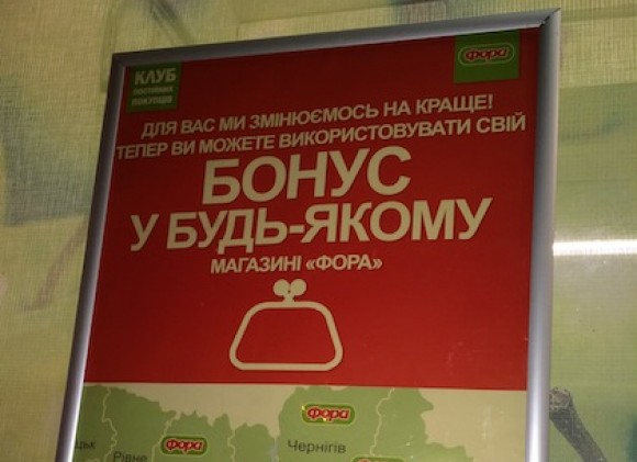 "Фора" (бул. Дарницкий, 23). На фасаде магазина размещены рекламные плакаты небольших размеров. В помещении реклама отсутствует. Своим покупателям сеть предлагает 2 вида каталогов: каталог с акционными товарами под девизом "Свіжі знижки" и каталог с предложениями экстрабаллов для постоянных покупателей.