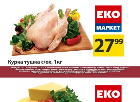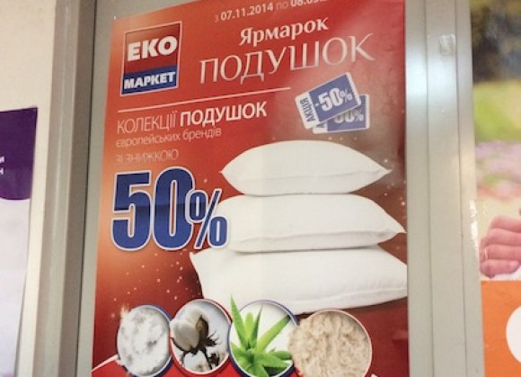 "Эко-Маркет" (ул. Маршала Малиновского, 12). Реклама на фасадах отсутвует. Рекламные плакаты небольшого размера размещены в помещении магазина. Оригинальной оказалась реклама отдельных товаров в магазине: большие картонные макеты не были замечены ни в одном другом супермаркете. "Эко-Маркет" предлагает несколько видов каталогов с акционными товарами, а также анонсирует бонусную программу пенсионерам.