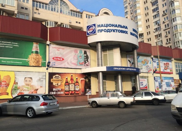 "АТБ" (ул. Маршала Тимошенко, 29б). Рекламные плакаты с указанием цен размещены на фасаде, витринах магазина. Небольшой каталог информирует потребителей о текущих акциях и гласит: "Висока якість — низька ціна!".