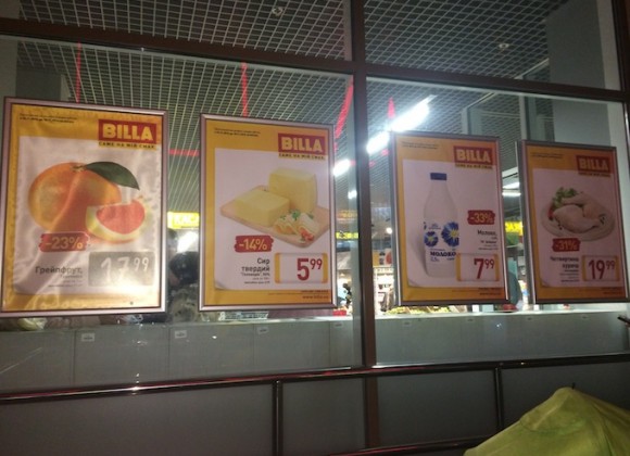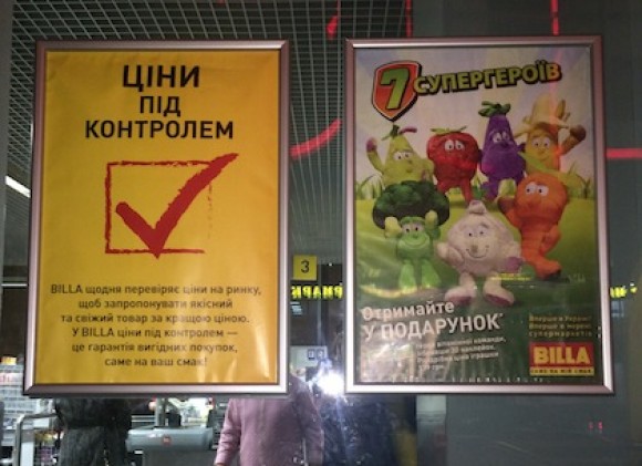 Billa (ул. Андрея Малышко, 3). Как и в магазинах "Фора", не очень большие рекламные плакаты размещены на фасаде магазина. Под слоганом "Billa. Саме на мій смак" они информируют покупателя не только о продукции и текущих акциях, но и об открытых вакансиях. Аналогичную информацию можно найти и в рекламном каталоге.