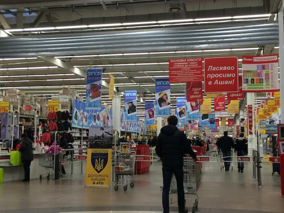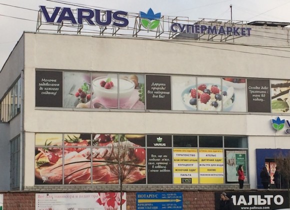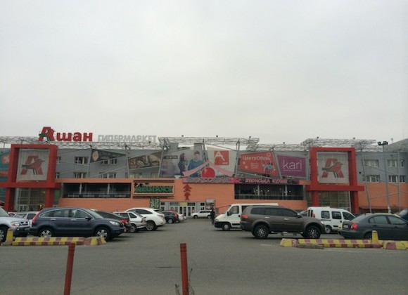 "Ашан" (ул. Большая Окружная, 4). На фасаде торгового центра расположена только реклама арендаторов, а не продуктового гипермаркета. В проходах используются POS-материалы с ценами на отдельные товары и со слоганом магазина: "Удар по цінах!".