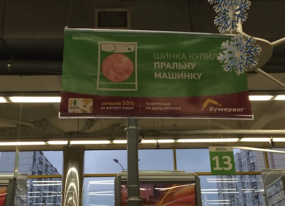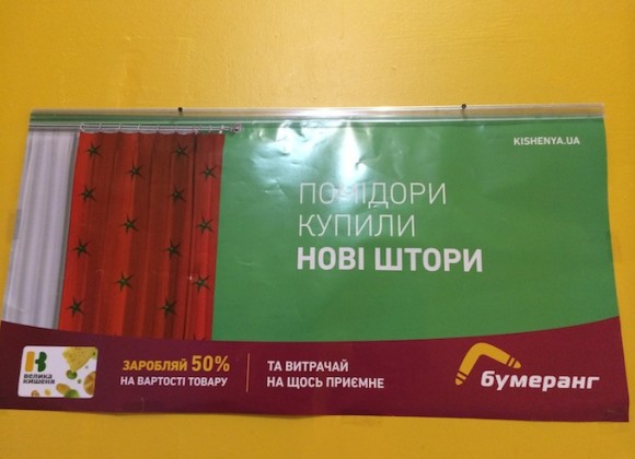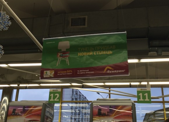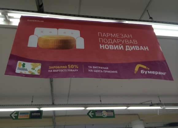 "Велика Кишеня" (пл. Дружбы Народов, 6). В магазине отсутствует реклама на фасадах, но в пространстве магазина размещено много рекламных плакатов с веселыми слоганами: "пармезан подарував новий диван", "шинка купила пральну машинку", "тунець придбав новий стілець", "помідори купили нові штори" и др. Магазинный каталог предлагает покупателям "товары недели" по акционным ценам с указанием процента скидок под общий девиз: "Акція діє, кишеня радіє".