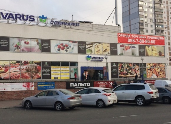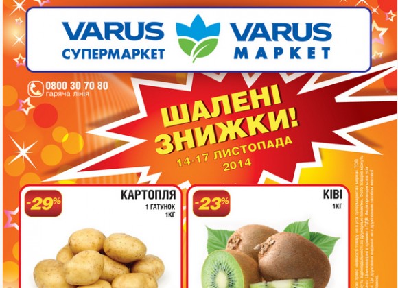 Varus (пр. Оболонский, 20а). На фасадах размещены привлекательные изображения еды без указания цен. Рекламный каталог привлекает внимание покупателей фразой "Шалені знижки!".
