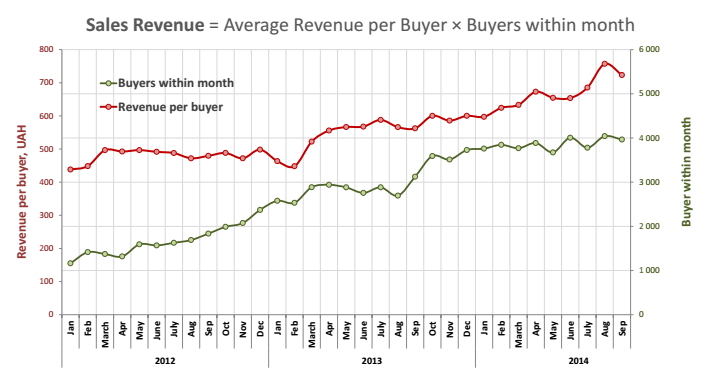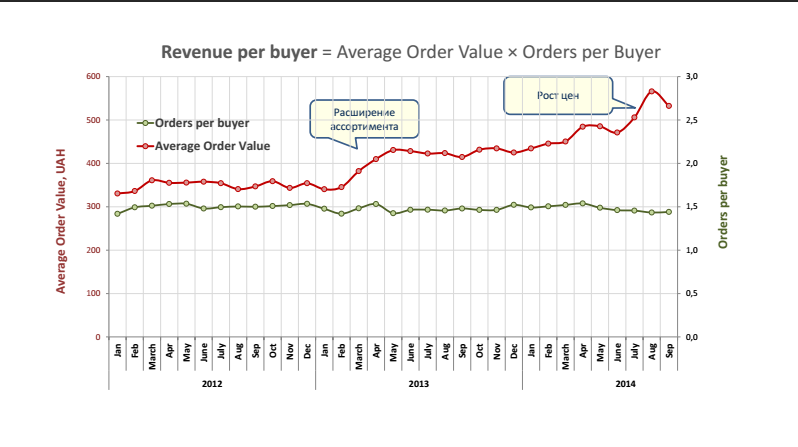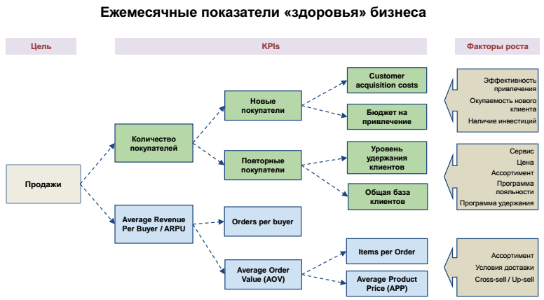 Для привлечения новых клиентов необходимо анализировать срок их окупаемости. Для повторных клиентов факторами роста будут служить цена, сервис, ассортимент, программы лояльности и программа удержания. Количество позиций в чеке и средняя цена продукта будут зависеть от условий доставки, ассортимента и применения методик cross-sell/up-sell.