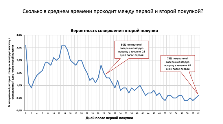В среднем аналитики вывели формулу повторной покупки в течение 28 дней, при условии что на 15-й день компания о себе напомнит.
