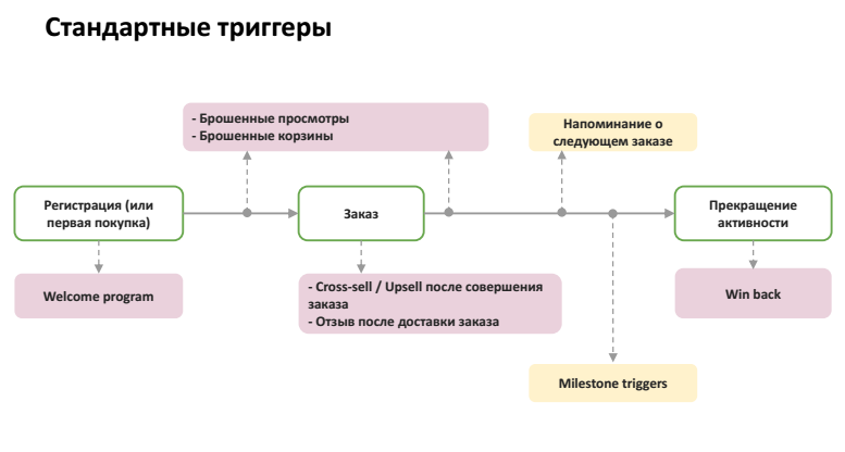 Также можно построить прогноз повторных покупателей, используя показатели общей базы покупателей и доли покупателей, совершающих повторную покупку в общем объеме. Для простого анализа можно использовать линию экспоненциального тренда из приложения XL. Важным элементом коммуникации является триггерная коммуникация.