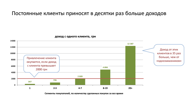 Идеальное соотношение между новыми покупателями и совершающими повторные покупки — 50/50. В условиях активного привлечения новых клиентов может получиться так, что часть базы составят случайные покупатели, которым понравилось что-то одно, и эта категория не будет особо прибыльной в дальнейшем.