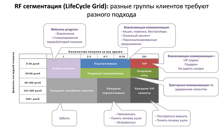 Если говорить о привлечении клиентов, то успех вложения средств зависит от правильного сегментирования покупателей: работать с каждым сегментом нужно по-разному. Коммуникации значительно поднимают уровень продаж, но при условии, что для каждого сегмента они будут разные. Не всегда самый большой сегмент приносит прибыль. Например, в одной из компаний, где Vip, составляющий всего 5%, может принести 40% прибыли, 17% постоянных клиентов приносят 30%, то есть в итоге 21% клиентов обеспечивает компании 70% прибыли. Поэтому необходимо тратить силы только на перспективную аудиторию. Для нее следует запустить WelcomProgram. Для постоянных клиентов включать кросс-сейл: выявить закономерности при совершении покупок и предлагать дополнительный товар, который наиболее часто покупают с основным, и не забывать делать ап-сейл — предлагать высокомаржинальный сопутствующий товар. Нерегулярным покупателям напоминать о покупке, предлагать другие товары и делать новостные месседжи о новинках. Покупателей сегмента «отток» могут подхлестнуть напоминания, скидки и выяснения причин.