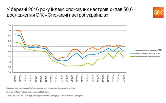 В марте 2016 года индекс потребительских настроений (ИПН) составлял 50,6, что на 3,6 п. меньше показателя февраля. Существенно снизился индекс целесообразности крупных покупок, но улучшились ожидания украинцев относительно курса гривны в ближайшие три месяца. Об этом свидетельствуют данные исследования потребительских настроений в Украине, которое ежемесячно осуществляет GfK Ukraine