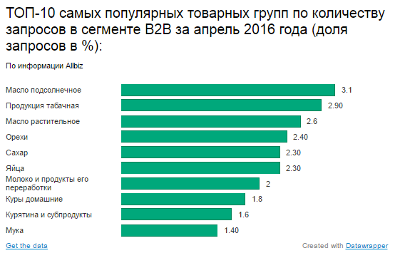 В апреле первая десятка востребованных товаров на Allbiz в сравнении с мартом значительно изменилась: в топ вошло шесть новых товарных групп. Хотя лидирующие позиции оставили за собой подсолнечное масло и табачная продукция (при этом в рейтинге за апрель они поменялись местами и пальма первенства досталась не табачной продукции). Тройку рейтинга замыкает растительное масло (остальные виды, кроме подсолнечного). Суммарная доля этих трех товарных групп составила 8,6% от общего количества заказов