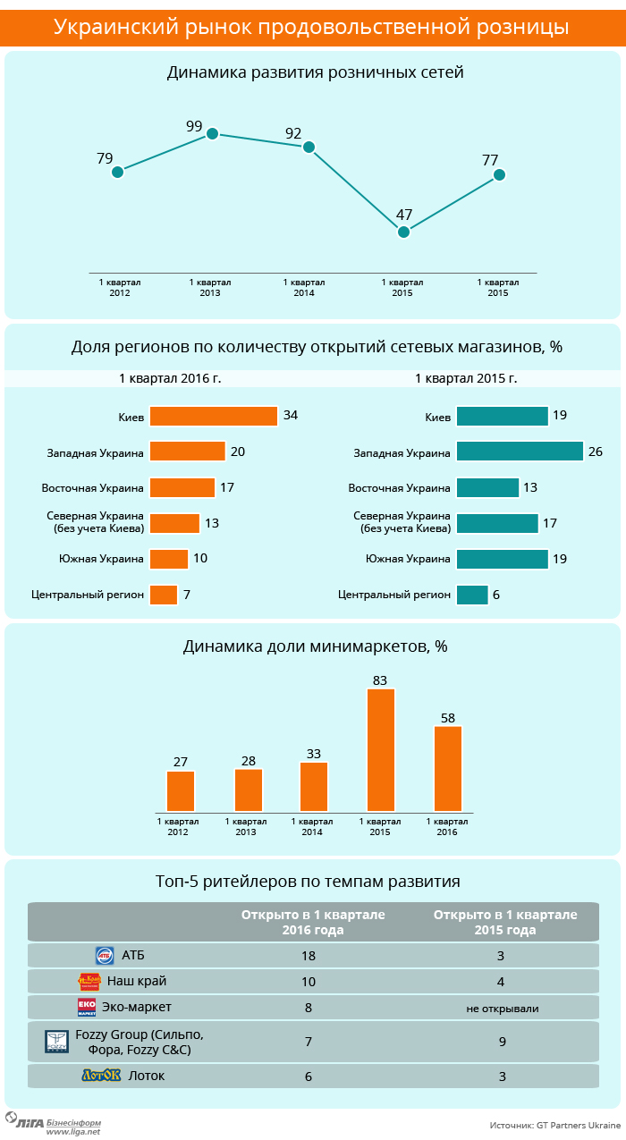 Традиционно лидером по развитию стала сеть дискаунтеров «АТБ», которая сейчас делает акцент на развитии в восточных областях. На втором месте — «Наш край», который открывает магазины по франчайзингу, а на третьем — «ЭКО-маркет». Компания Fozzy Group («Фора», «Сільпо» и пр.) оказалась на четвертом месте, открыв семь магазинов.