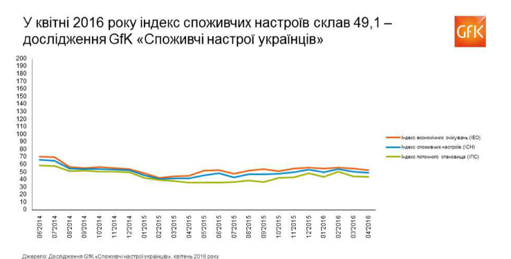 В апреле 2016 года потребительские настроения украинцев ухудшились: индекс потребительских настроений (ИПН) составил 49,1, что на 1,5 п. меньше показателя марта