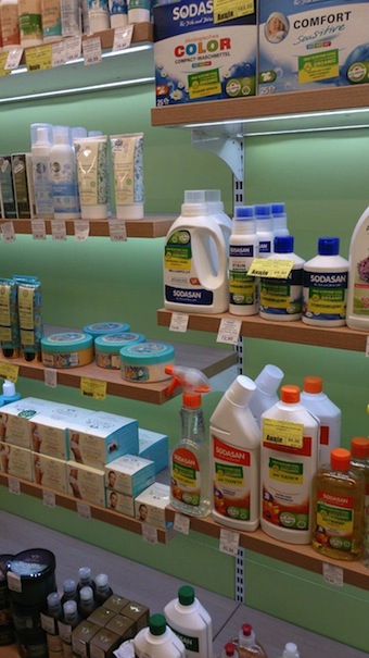 Для стойки с органическими товарами используется оборудование с имитацией фактуры дерева и дополнительной подсветкой. Эта группа хорошо выделена в этом магазине и находится в удачном месте.